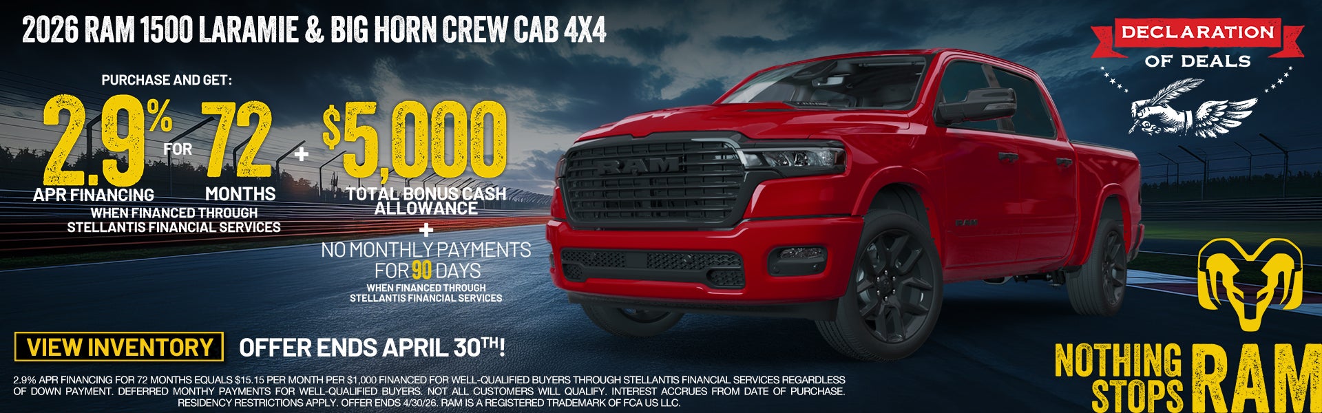 Save on new 2026 Ram 1500 Laramie & Big Horn CrewCab 4x4 models with 2.9% APR for up to 72 months + $5,000 Total Cash Allowance + Make no payments for 90 days!